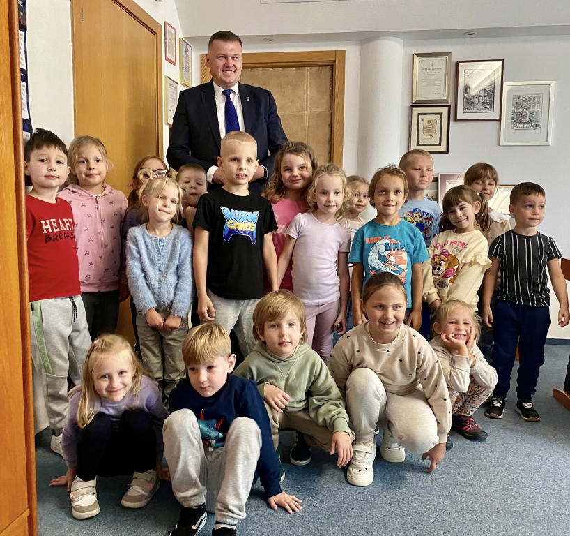 Grupa „Motylki” w ramach projektu edukacyjnego „Spacerkiem po Lubartowie” odwiedziła Ratusz Miejski w Lubartowie. Na początku dzieci spotkały się z Burmistrzem Miasta Krzysztofem Paśnikiem, który serdecznie przyjął małych gości w swoim gabinecie. Opowiedział im o pracy burmistrza, o tym jak wygląda codzienne zarządzanie miastem i podejmowanie decyzji ważnych dla mieszkańców.