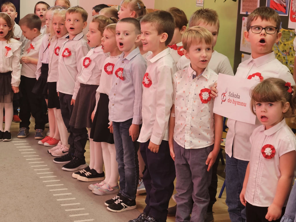 W ramach ogólnopolskiej akcji „Szkoła do hymnu” przedszkolaki wzięły udział we wspólnym śpiewaniu hymnu narodowego. Z dumą i powagą odśpiewaliśmy „Mazurka Dąbrowskiego”, świętując Święto Niepodległości 🇵🇱❤️